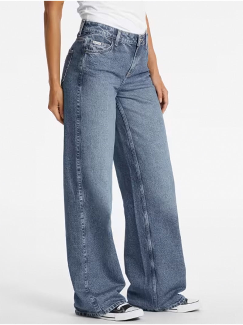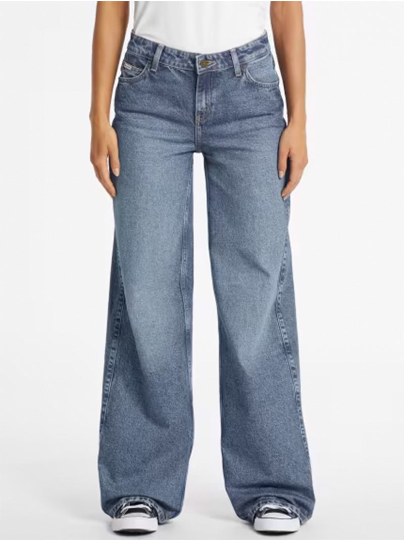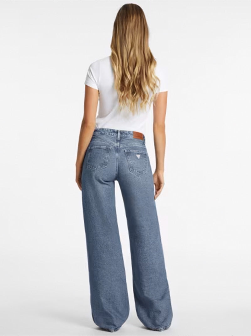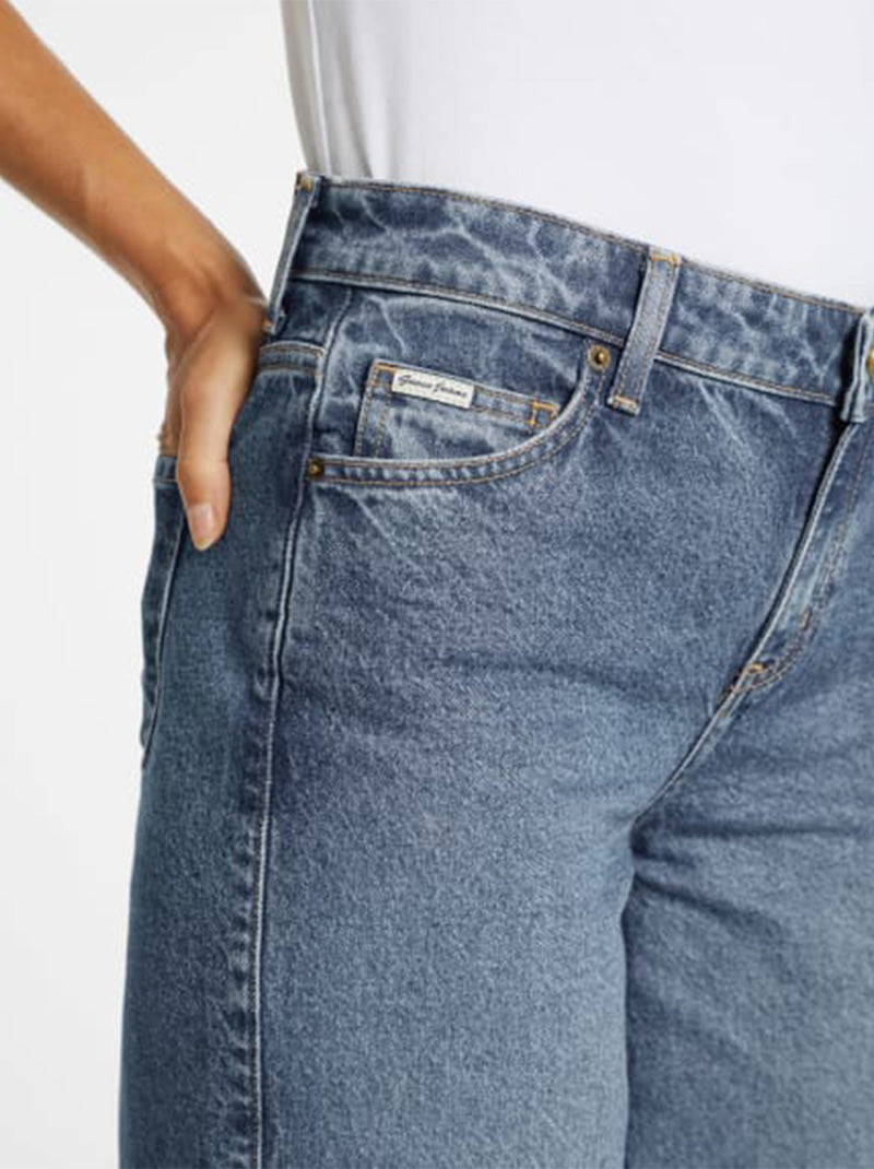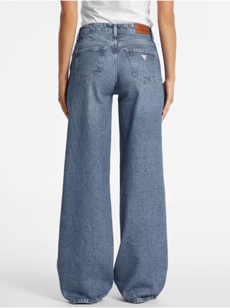 กางเกงยีนส์ทรงขาบานผสมผสานสไตล์คลาสสิกและความทันสมัย สีน้ำเงินยีนส์แบบย้อมเฟด ผลิตจากผ้าเดนิมซิกเนเจอร์ของ GUESS JEANS ที่ผ่านกรรมวิธี GUESS AIRWASH™