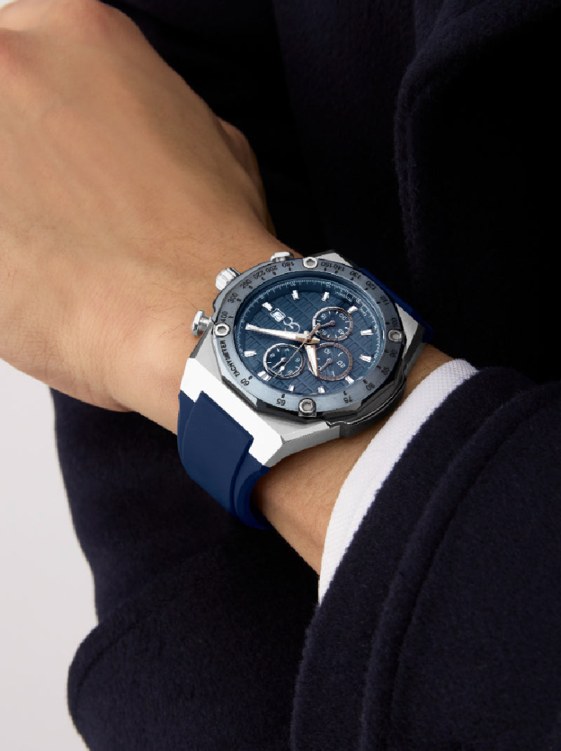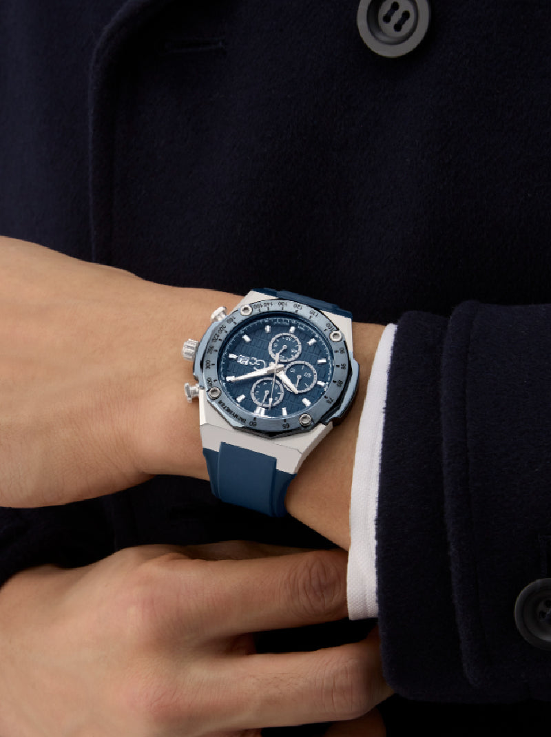 โดดเด่นด้วย Gc Idol Sport Chrono การผสมผสานอันโดดเด่นระหว่างสไตล์ที่โดดเด่น จิตวิญญาณสปอร์ต และความแม่นยำแบบสวิสคราฟต์ ตัวเรือนทรงกลมขนาด 45 มม. อันโดดเด่น ผลิตจากสแตนเลสสตีล 316L ทนทาน โดดเด่นด้วยการผสมผสานสีเงินขัดเงาและสีเงินด้านเข้ากับการชุบสีน้ำเงินเข้ม มอบความทันสมัยและหรูหราในแบบสปอร์ต ตัวเรือนทรงปีกที่โดดเด่นและสกรูอันเป็นเอกลักษณ์ มอบความโดดเด่นทางเทคนิคและความแข็งแกร่งให้กับดีไซน์ วงแหวนด้านบนทรงโค้งมนพร้อมสเกลทาคีมิเตอร์ในตัว เสริมประสิทธิภาพอันน่าประทับใจ