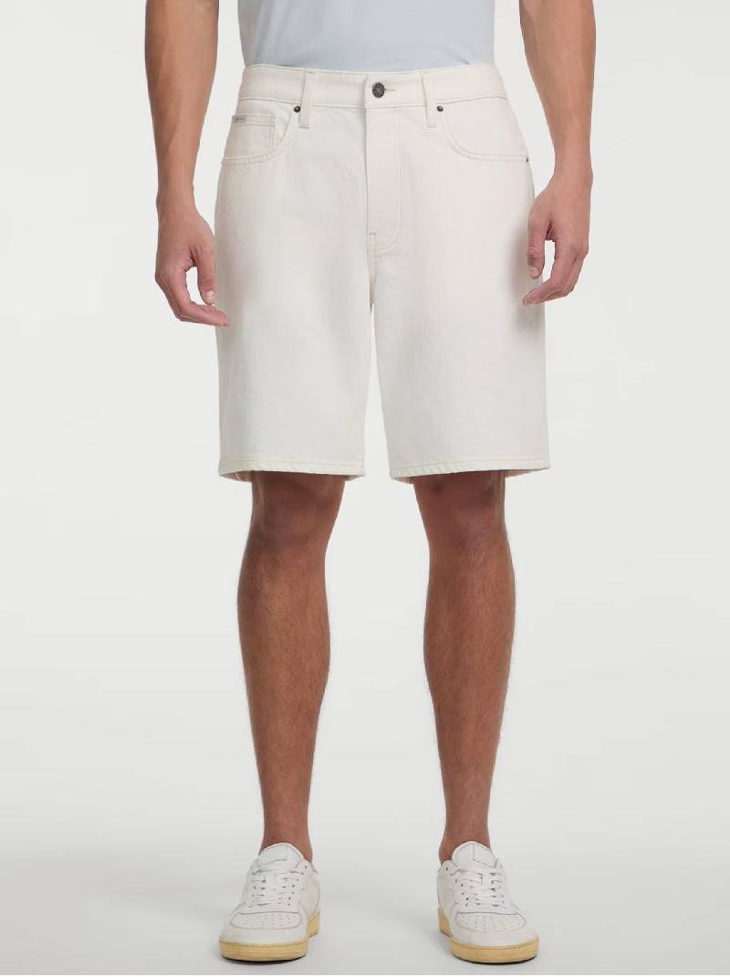 กางเกงขาสั้นยีนส์สีเบจ ผลิตจากผ้า Bull Denim คุณภาพสูง ผสมผสานผ้าฝ้ายธรรมดา 64% ผ้าฝ้ายออร์แกนิก 35% และอีลาสเทน 1% ที่ช่วยเพิ่มความยืดหยุ่นและสวมใส่สบาย มาพร้อมดีไซน์เอวสูงปานกลาง ทรงเข้ารูปตั้งแต่สะโพกลงมาและขาตรงที่ให้ลุคดูทันสมัยแบบเรียบง่าย ดีเทลครบด้วยกระเป๋า 5 ช่อง โลโก้ปะ และการปิดด้วยซิปที่ใช้งานสะดวก เพิ่มความโดดเด่นด้วยผ้าเดนิมฟอกสีอ่อนที่ช่วยเสริมลุคสบายตาและแมทช์ได้หลากหลายสไตล์ในทุกโอกาส