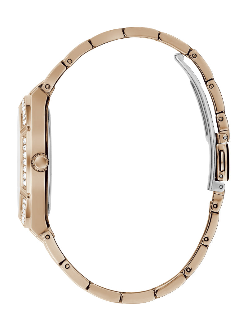 นาฬิกา GUESS ที่ผสานความหรูหรากับความโรแมนติก ตัวเรือนและสายสแตนเลสชุบโรสโกลด์ ขอบหน้าปัดประดับคริสตัลเพิ่มเสน่ห์อันอ่อนหวาน หน้าปัดสีอ่อนพร้อมตัวเลขโรมัน เติมเต็มลุคอย่างมีระดับ เหมาะสำหรับผู้หญิงที่ชอบความหรูหราในโทนโรแมนติก