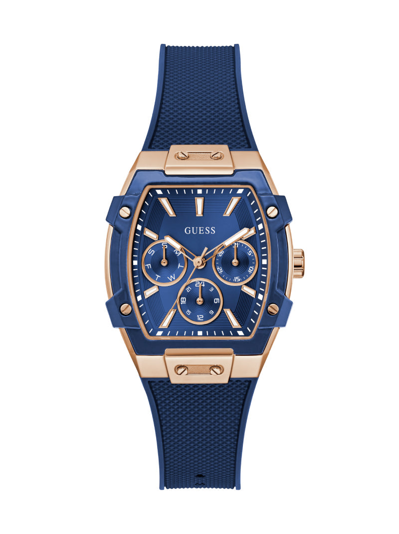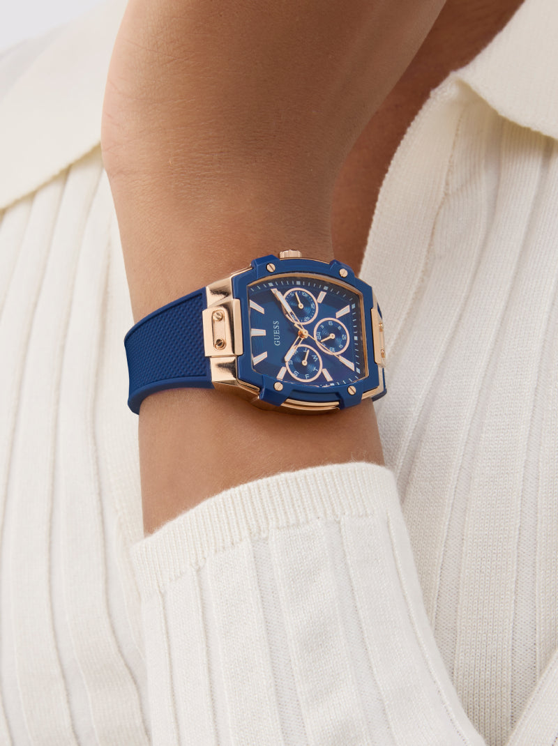 หรูหราและมีสไตล์ นาฬิกา GUESS เรือนนี้มาพร้อมตัวเรือนทรงเหลี่ยมโทนโรสโกลด์ จับคู่สายซิลิโคนสีน้ำเงินลายเท็กซ์เจอร์ หน้าปัดสีน้ำเงินเข้ากัน พร้อมซับไดอัลมัลติฟังก์ชันที่ตอบโจทย์การใช้งานประจำวัน ดีไซน์ที่ทันสมัยและเหนือระดับ เสริมความมั่นใจในทุกลุค