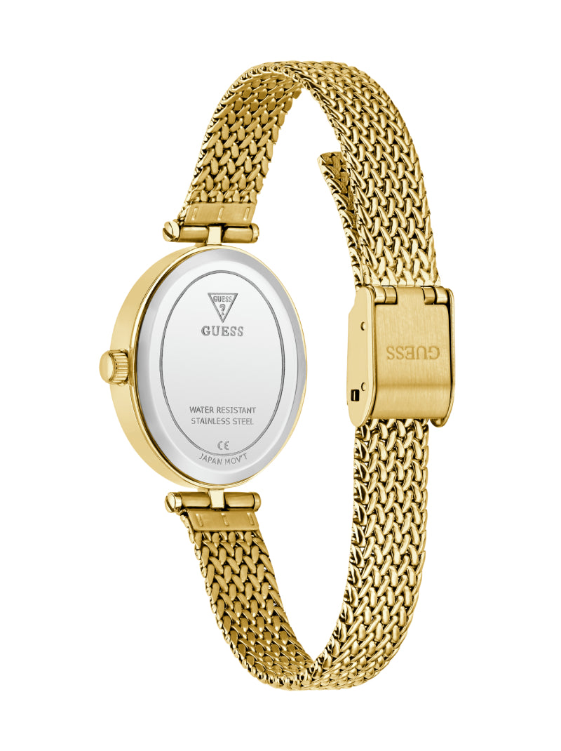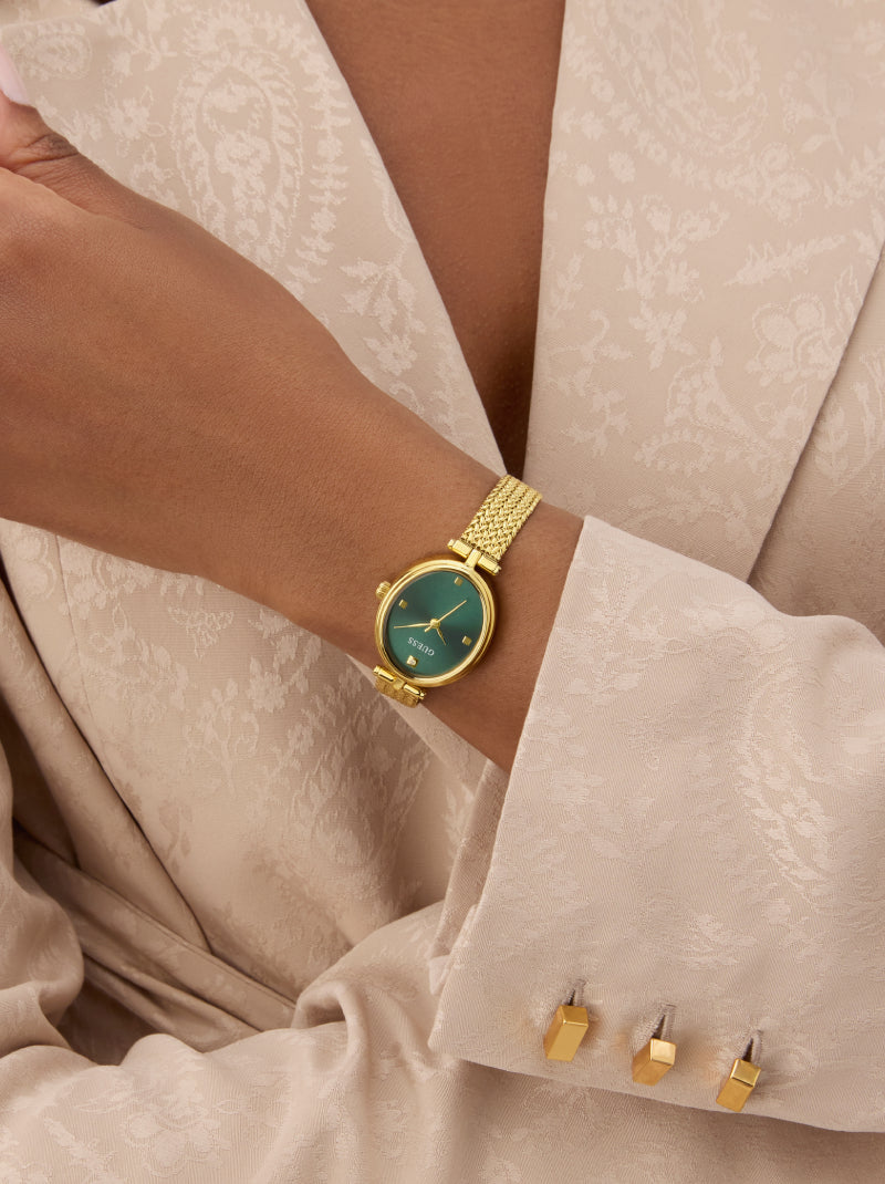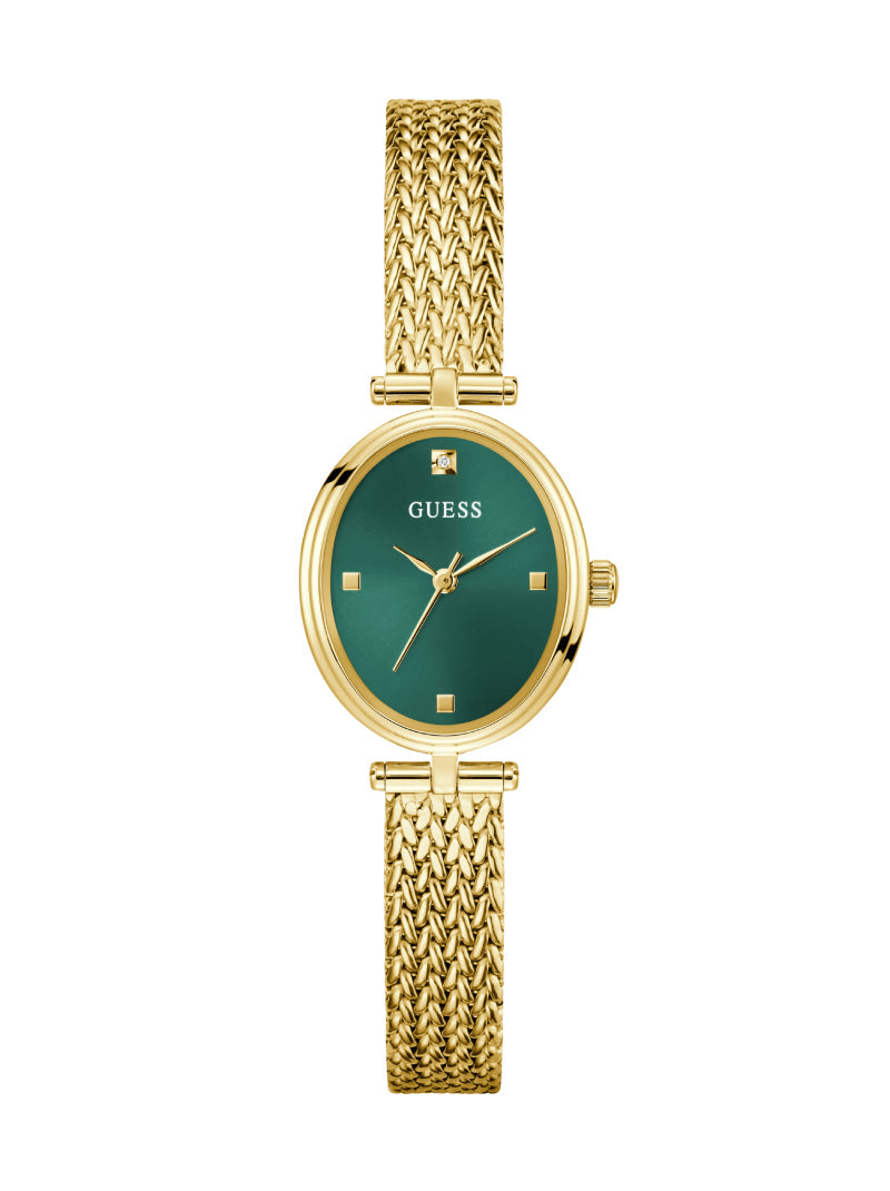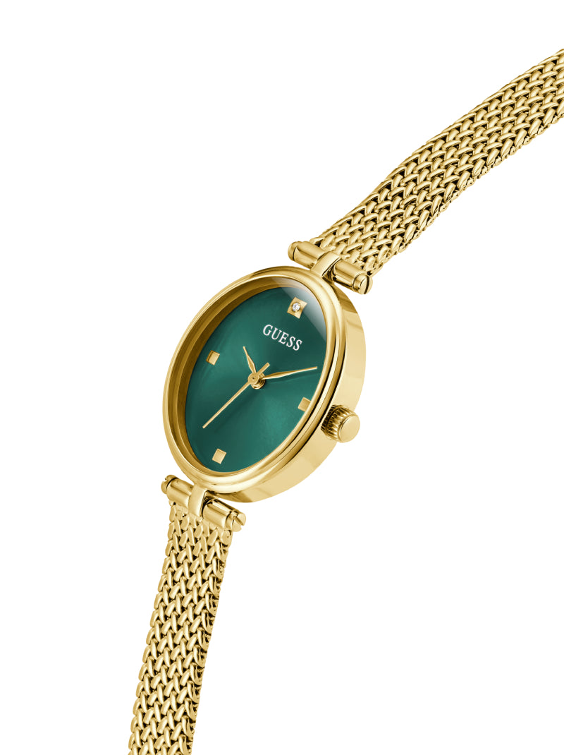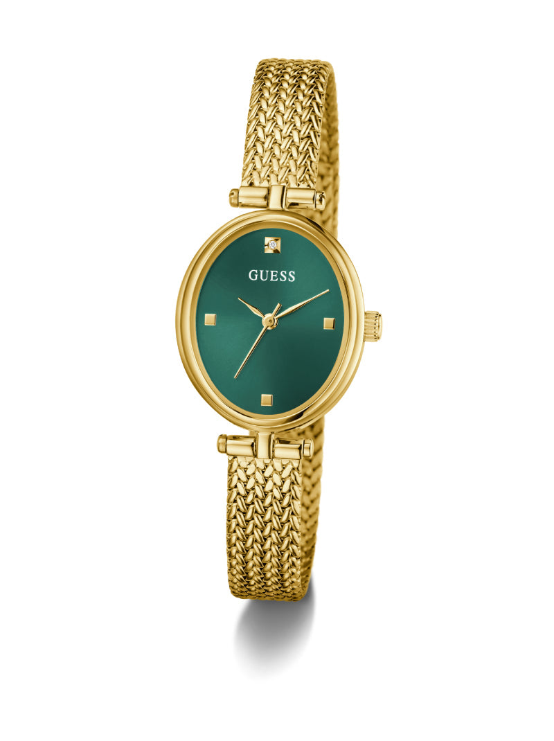 นาฬิกา GUESS โดดเด่นด้วยสายถักสีทองหรูหรา จับคู่กับหน้าปัดสีเขียวสะดุดตา มาพร้อมรายละเอียดคริสตัลที่ตำแหน่ง 12 นาฬิกา เสริมเสน่ห์แห่งความหรูหราและแฟชั่นอย่างลงตัว เหมาะสำหรับผู้หญิงที่ชื่นชอบการแสดงออกถึงความมั่นใจและรสนิยมที่ทันสมัย