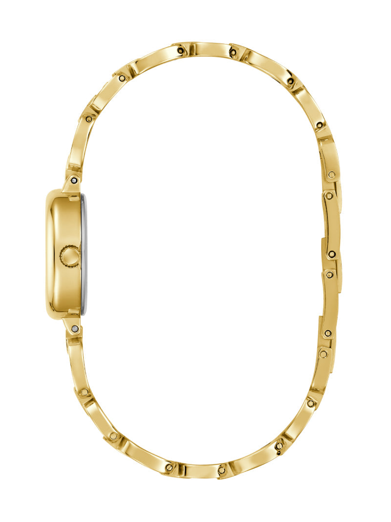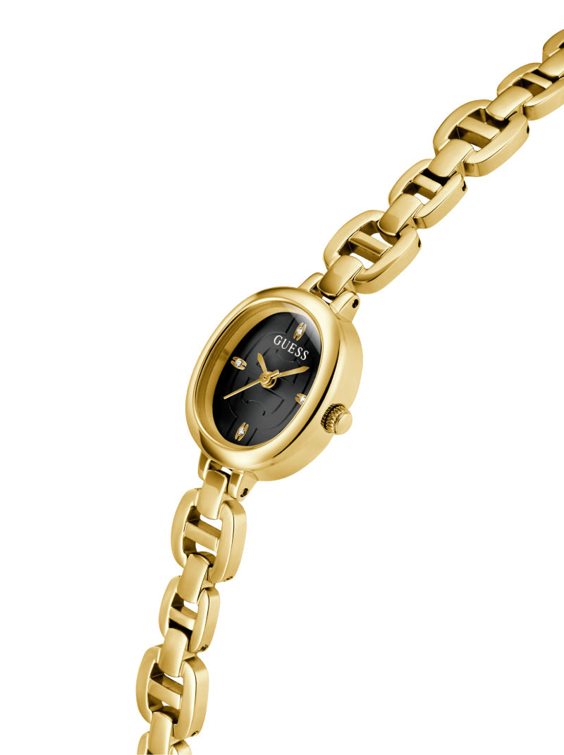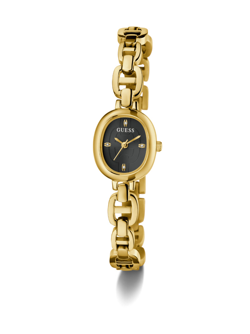 นาฬิกา GUESS รุ่นสายสีทอง หน้าปัดดำ เผยความโก้หรูและทันสมัย หน้าปัดมินิมอลประดับคริสตัลตัดกับตัวเรือนสีทองอย่างลงตัว สะดุดตาในทุกมุมมอง เหมาะสำหรับผู้หญิงที่ชื่นชอบความหรูหราคลาสสิกผสมความโมเดิร์น