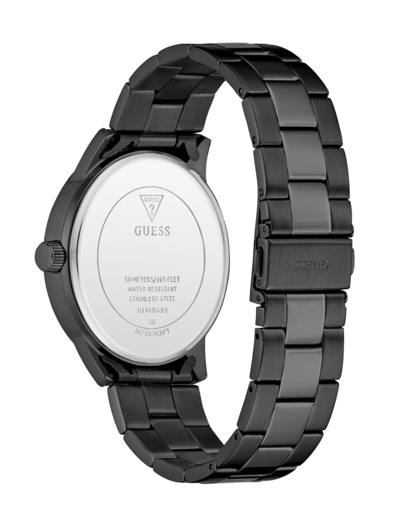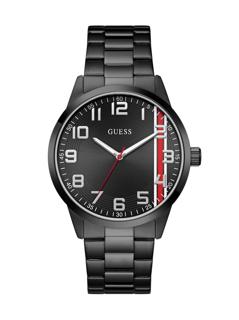 นาฬิกา GUESS Speedometer มาพร้อมหน้าปัดสีดำขนาดใหญ่และตัวเรือนสเตนเลสสตีลที่แข็งแรง สายสเตนเลสสตีลขัดเงาเสริมความหรูหราและทันสมัย เหมาะสำหรับผู้ที่ต้องการนาฬิกาที่สะท้อนสไตล์และความมั่นใจในทุกโอกาส