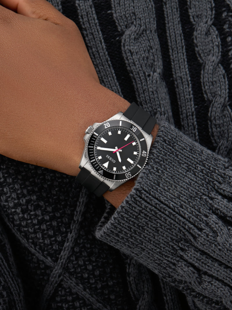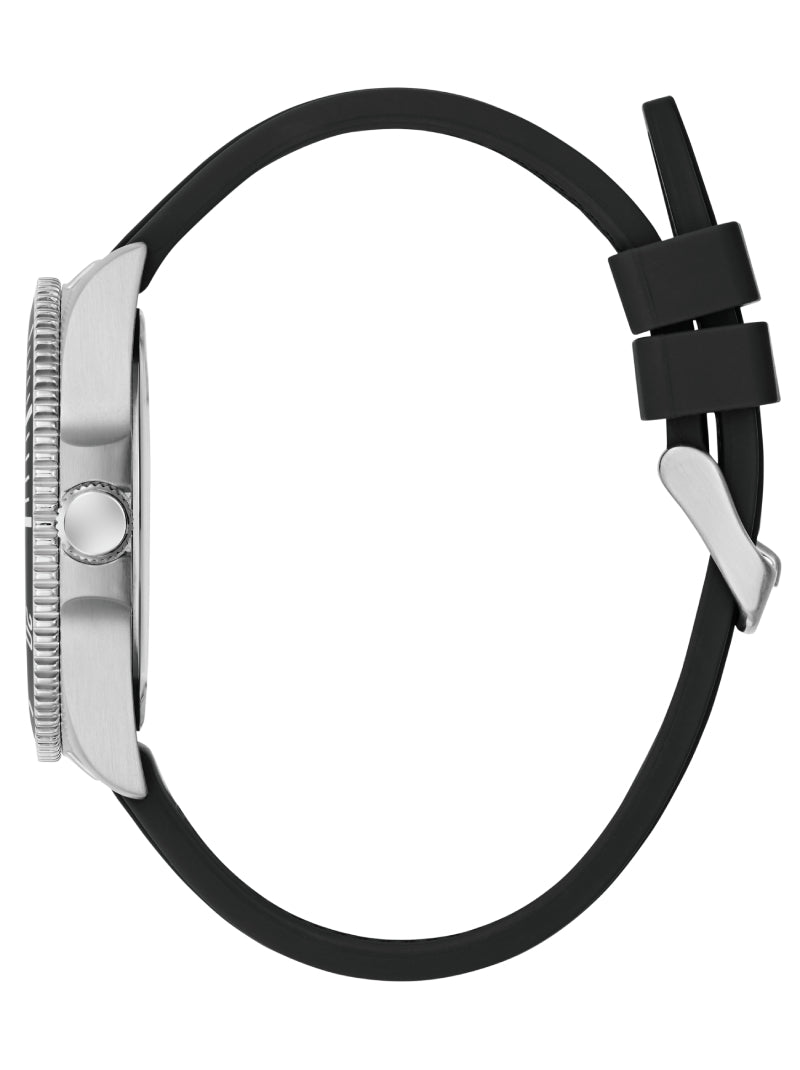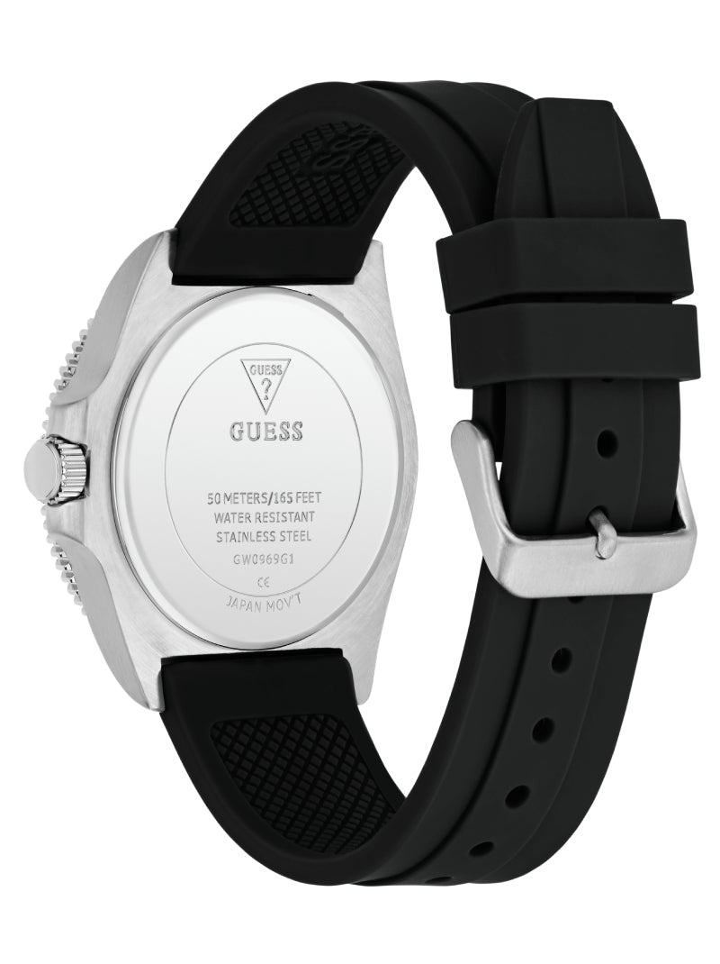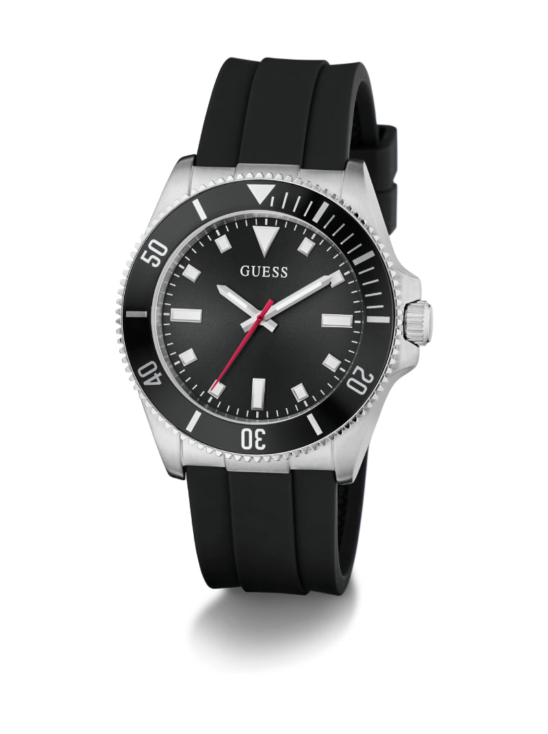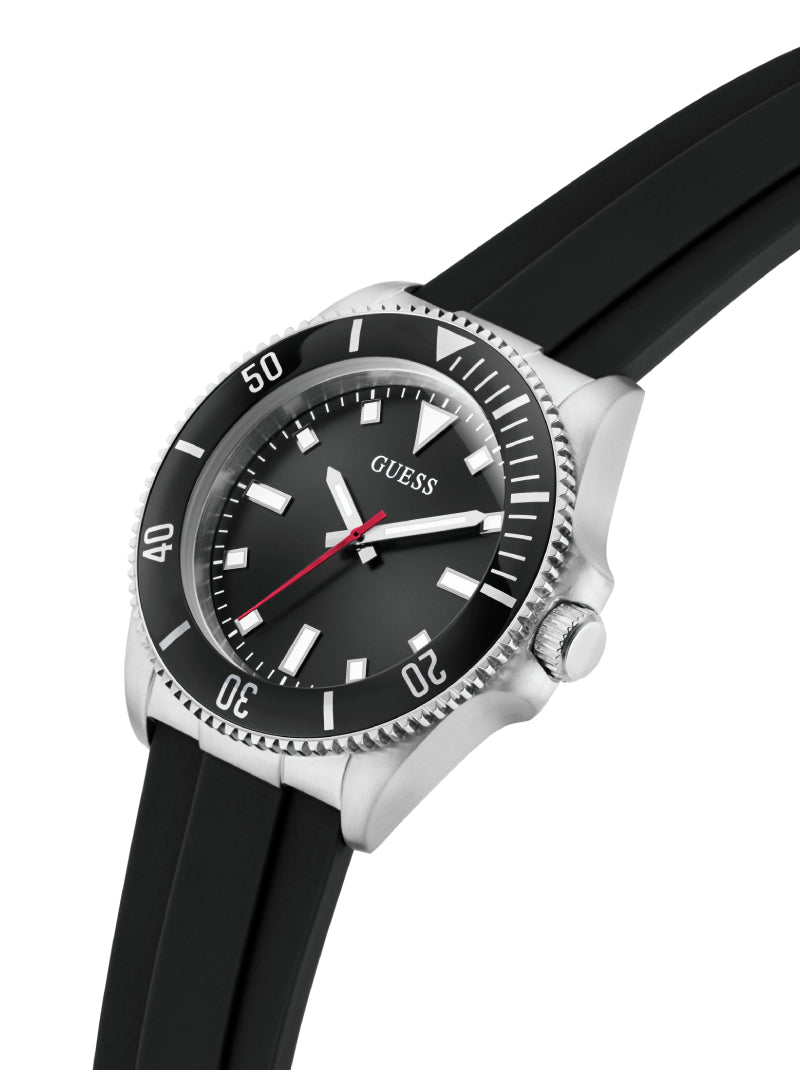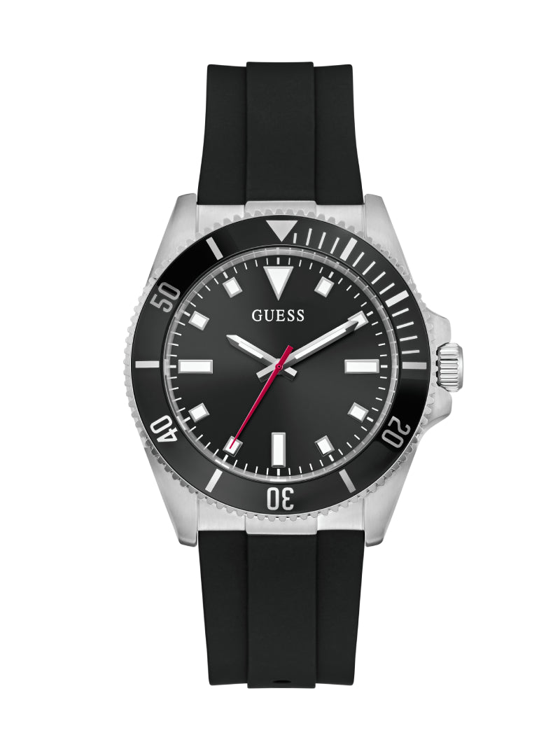 นาฬิกา GUESS สายซิลิโคนสีดำ ดีไซน์สปอร์ตและสวมใส่ได้หลากหลาย ตัวเรือนสแตนเลสสีเงิน หน้าปัดสีดำโดดเด่นด้วยหลักชั่วโมงเรืองแสงและเข็มวินาทีสีแดงสด เพิ่มความมีพลังและทันสมัย ใส่สบายเหมาะกับการใช้งานในทุกวัน