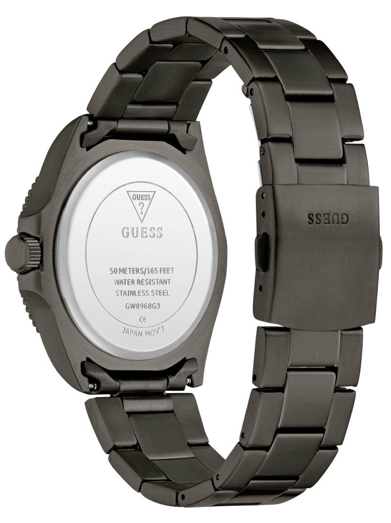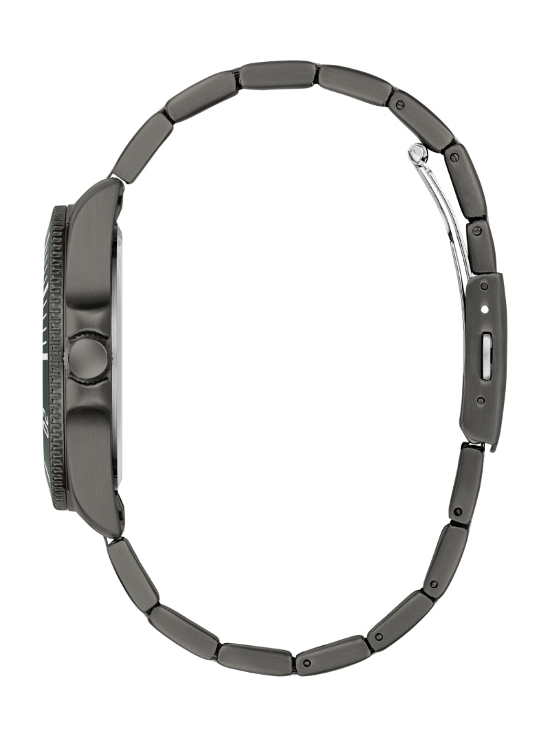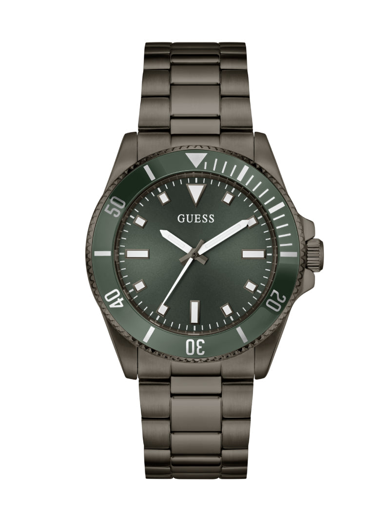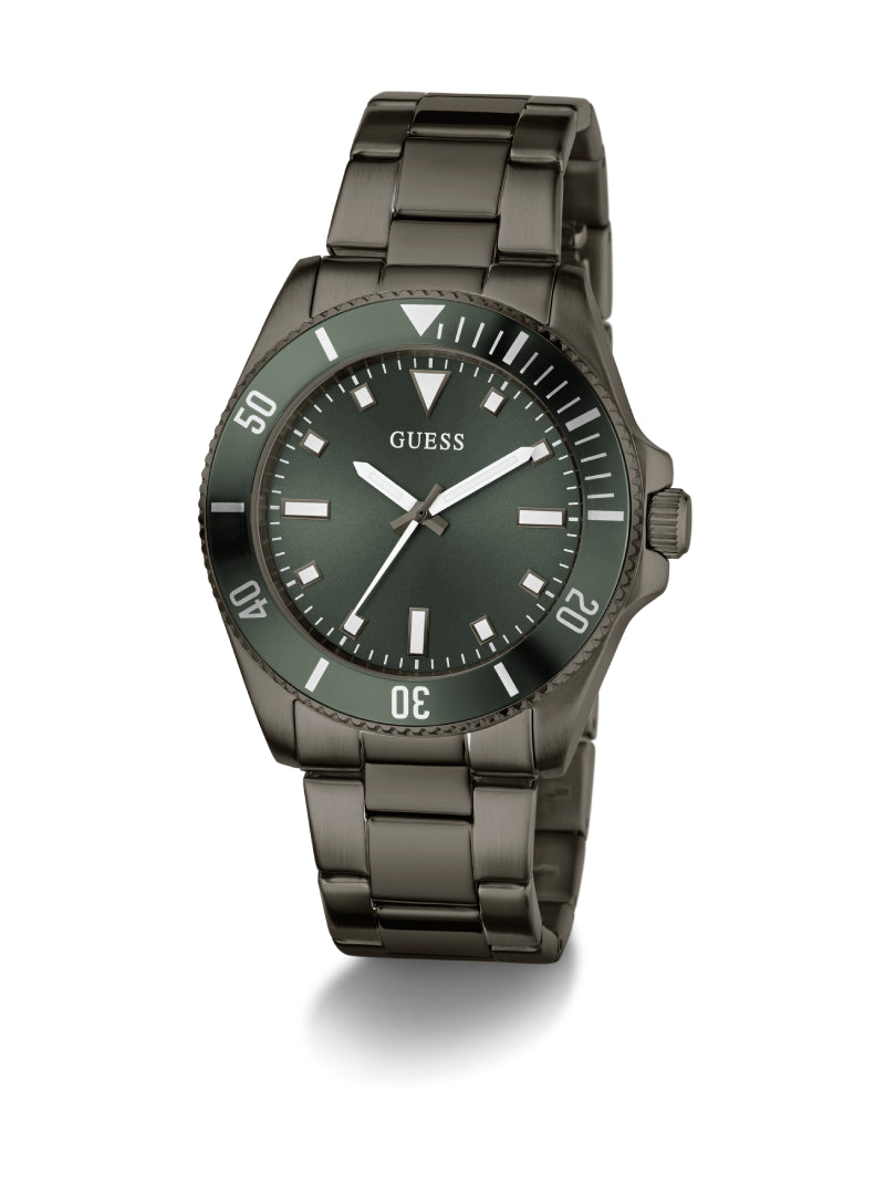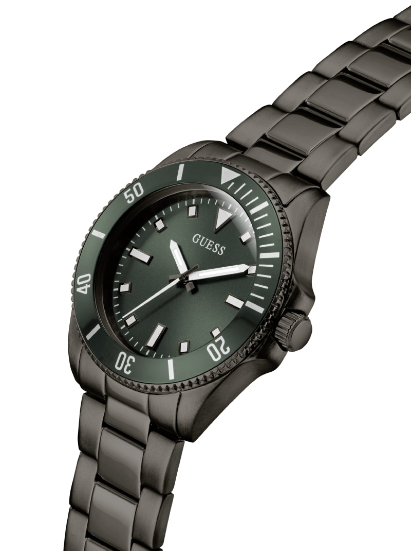 นาฬิกา GUESS โทนก้านปืน (Gunmetal) ให้ลุคทันสมัยและทรงพลัง มาพร้อมสายสแตนเลสและหน้าปัดเขียวอมดำ ดีไซน์ผสมผสานความสปอร์ตกับความหรูหราอย่างลงตัว สามารถใส่ได้ทั้งวันทำงานและวันสบาย ๆ