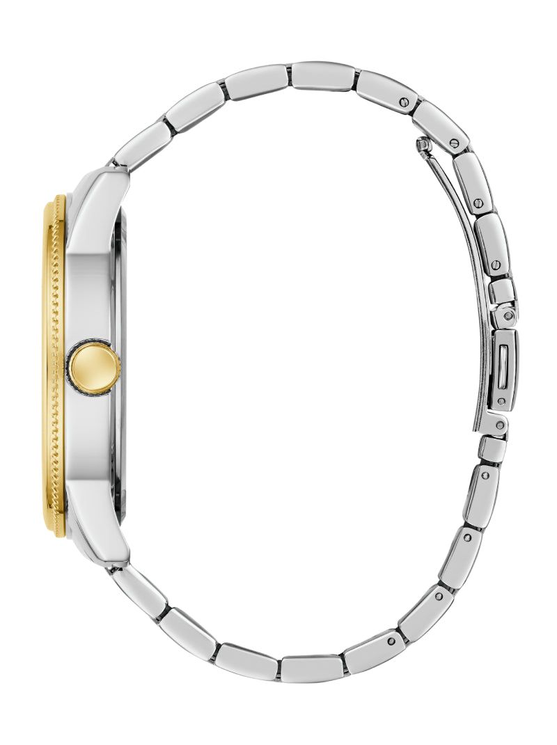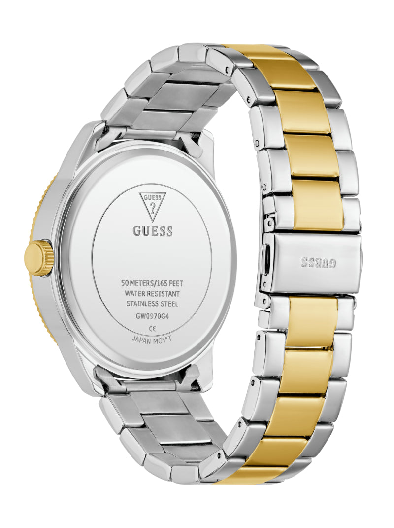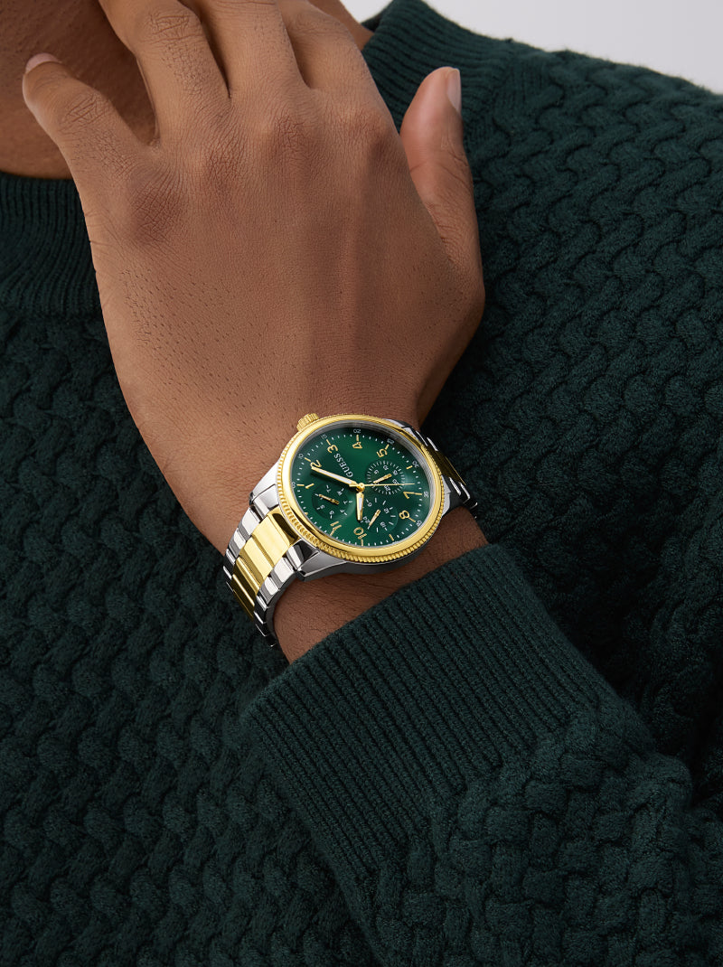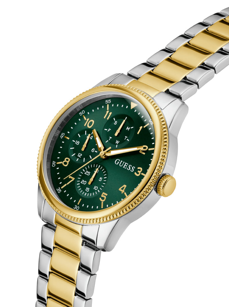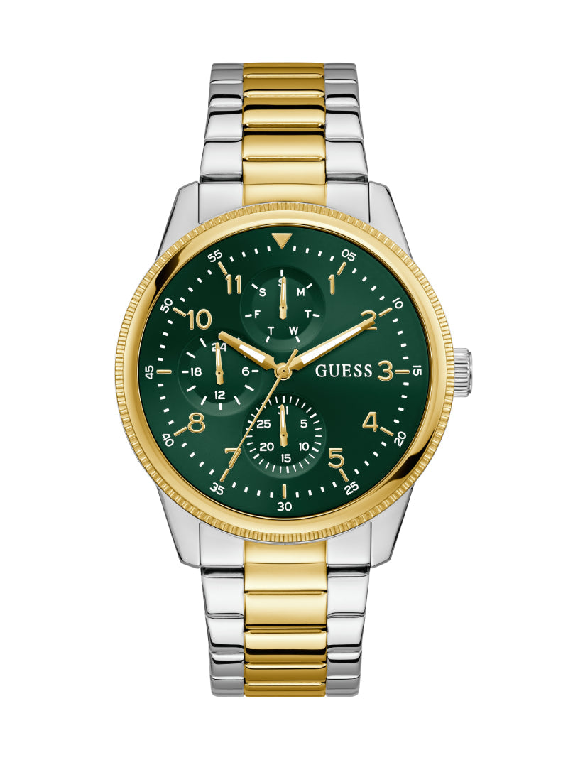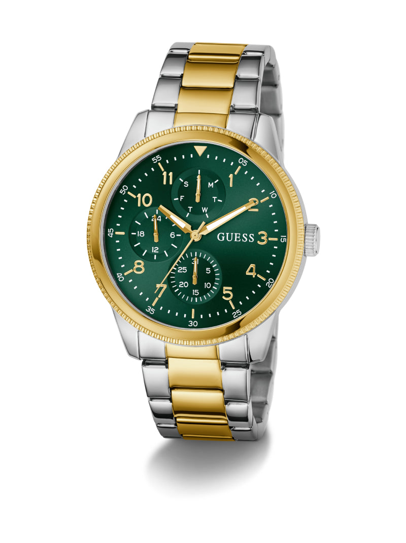 นาฬิกา GUESS ดีไซน์ทูโทนผสมผสานสแตนเลสสีเงินและทอง มาพร้อมหน้าปัดมัลติฟังก์ชันสีเขียวสุดโดดเด่น เพิ่มความหรูหราด้วยหน้าปัดย่อยสไตล์โครโนกราฟที่แสดงวัน วันที่ และระบบ 24 ชั่วโมง ทั้งดูดีและใช้งานได้จริง เหมาะสำหรับผู้ชายที่ต้องการความสง่างามแบบทันสมัย