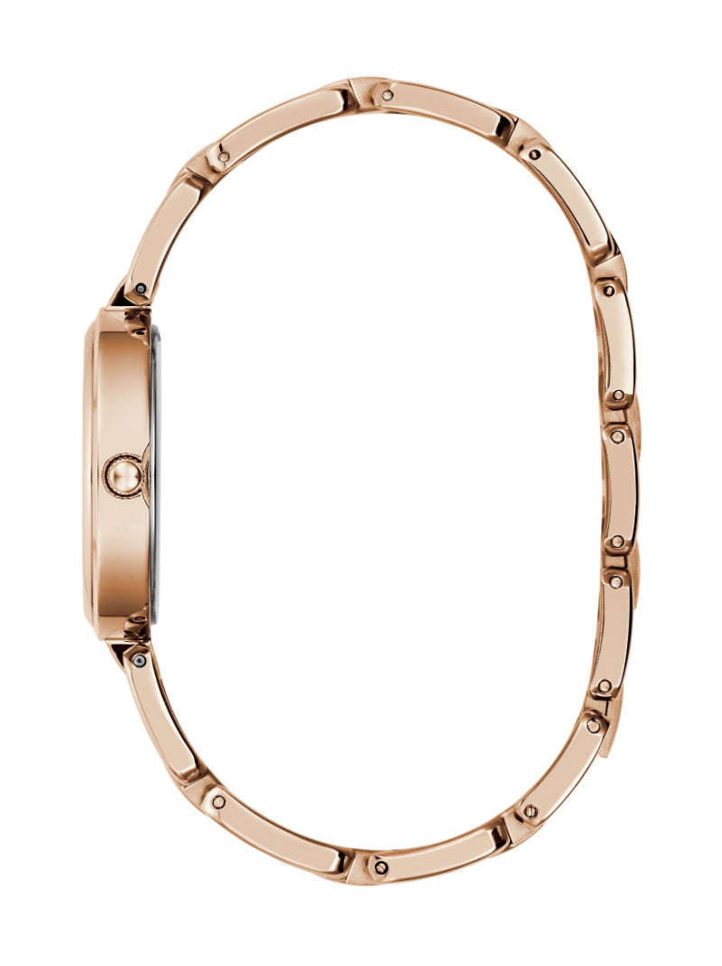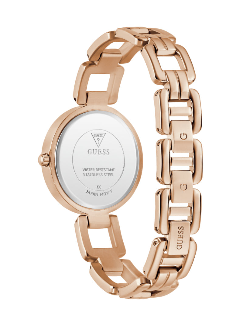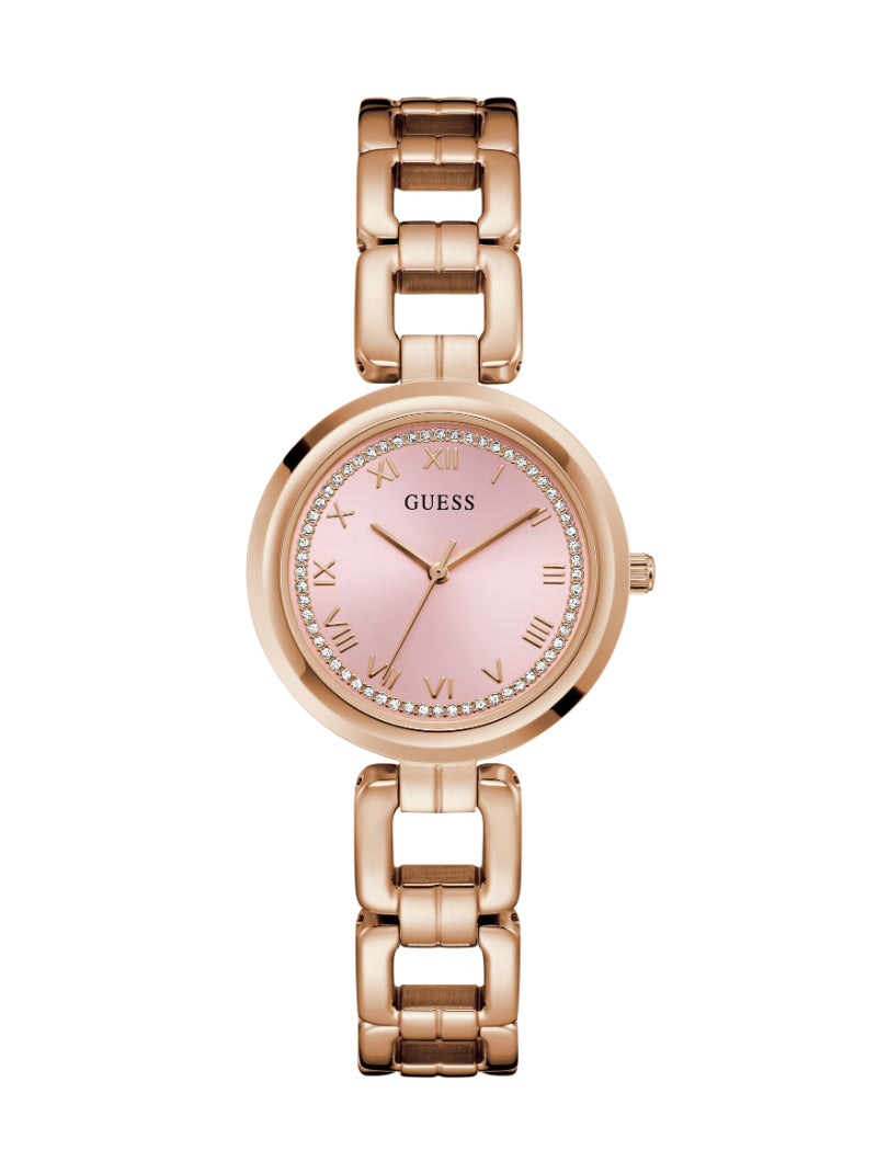 นาฬิกา GUESS โดดเด่นด้วยหน้าปัดสีชมพูทรงกลมขนาด 32 มม. ประกบกับตัวเรือนและสายสเตนเลสโทนโรสโกลด์ มอบความเรียบหรูที่น่าหลงใหลและพร้อมเติมเสน่ห์ให้ข้อมือคุณในทุกโอกาส