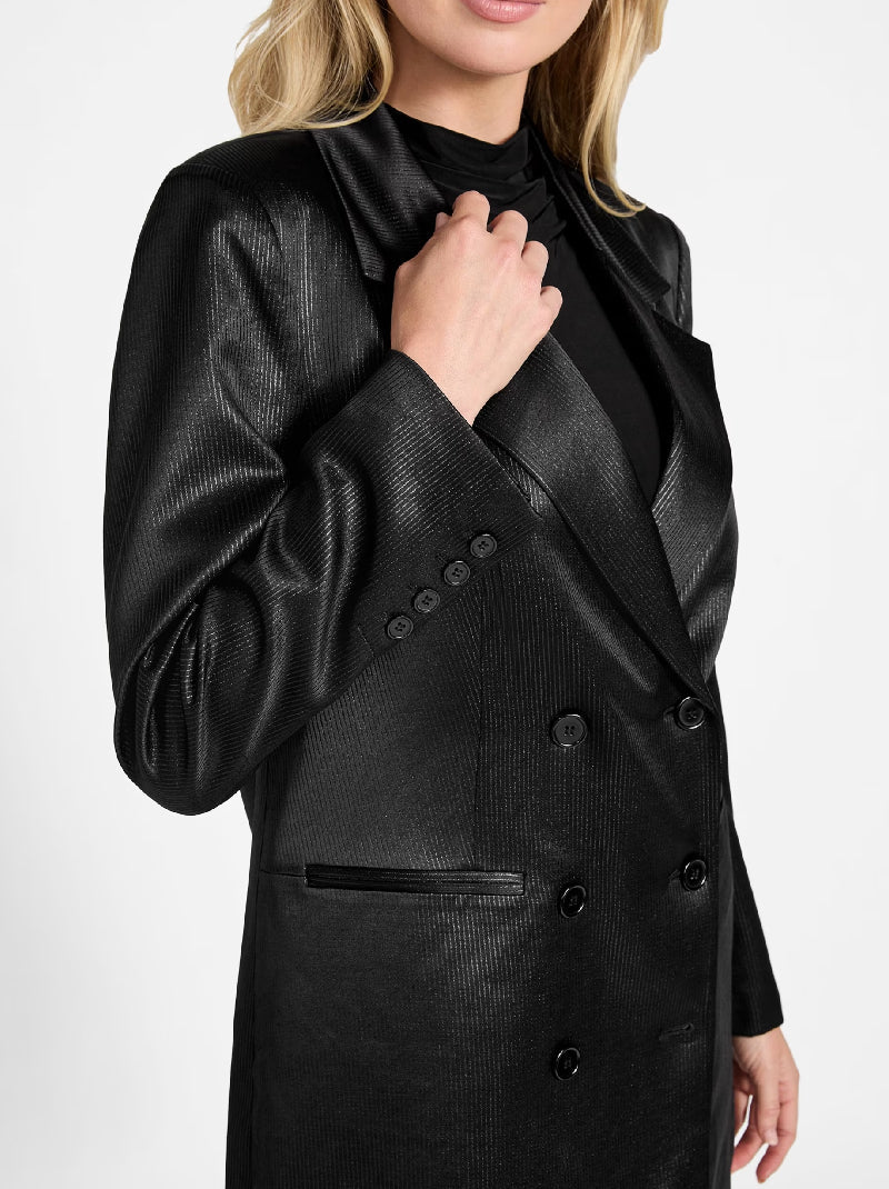 เสื้อเบลเซอร์สีดำทรงทักซิโด้ที่เดินเส้นพินสไตรป์อย่างคลาสสิก เผยความมั่นใจในสไตล์ผู้หญิงยุคใหม่ด้วยไหล่ทรงคมและฟินิชที่ปราณีต เหมาะสำหรับทุกโอกาสจากการประชุมในตอนเช้าไปจนถึงค็อกเทลยามค่ำคืน