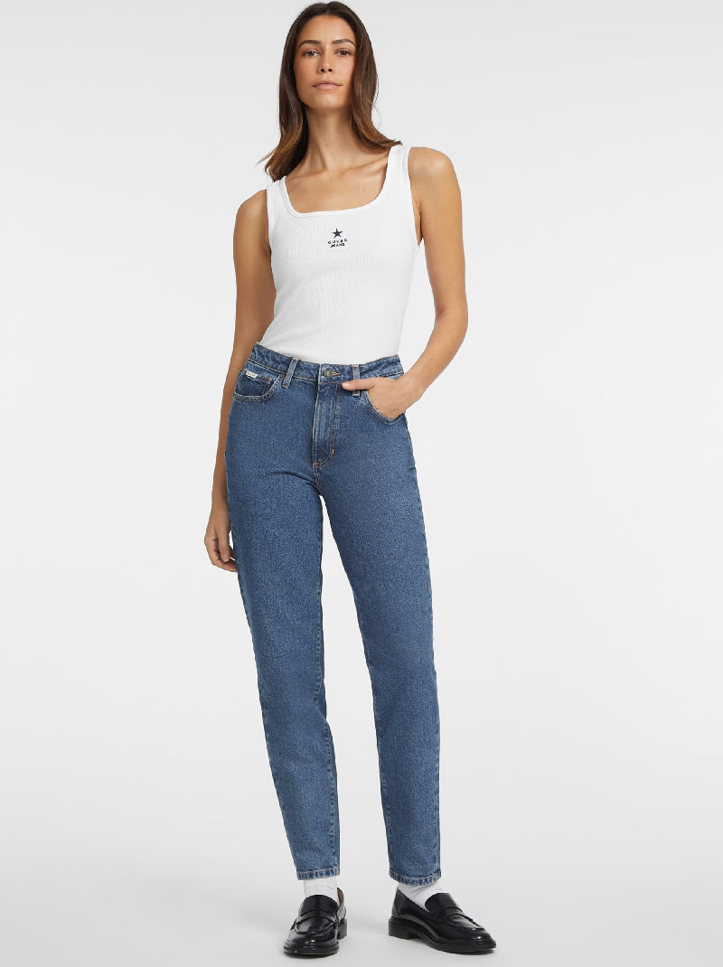 เสื้อกล้ามคอเหลี่ยมทรงเข้ารูป แต่งผ้าริบ ปักโลโก้รูปดาวและโมโนแกรมที่หน้าอก ผลิตจากผ้าฝ้ายผสมออร์แกนิกของเรา