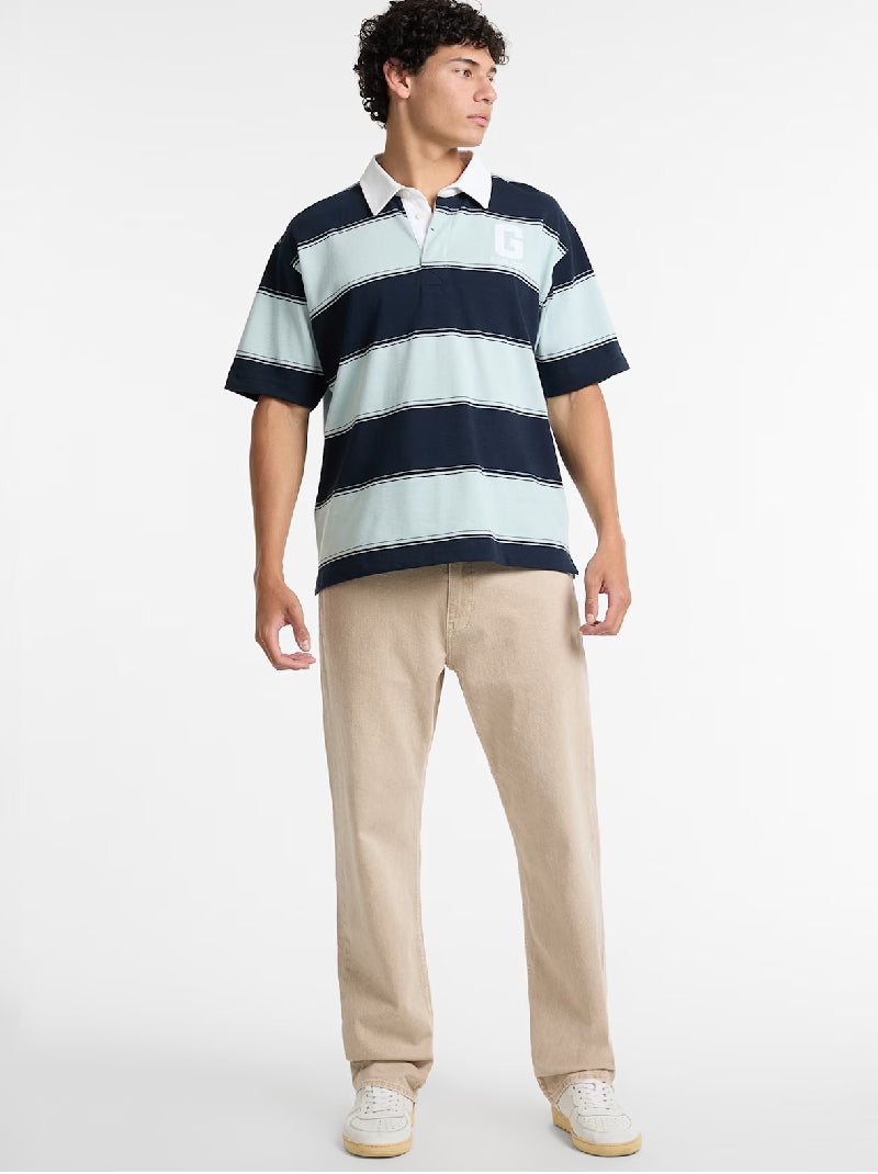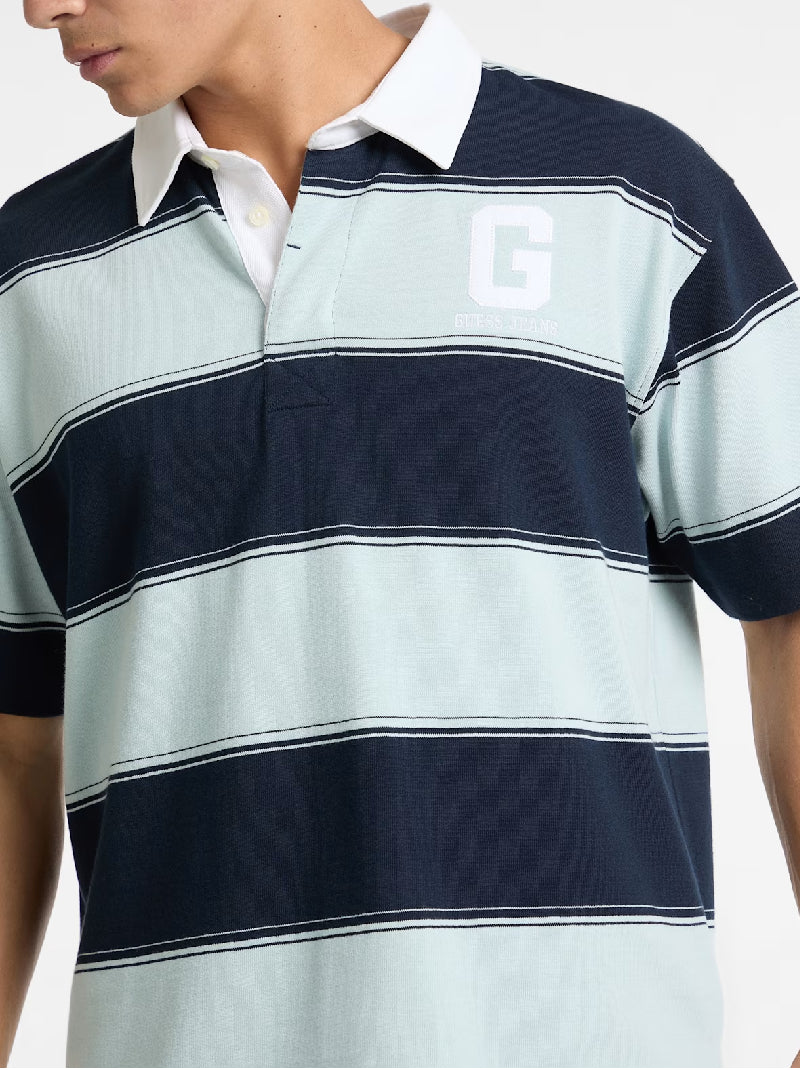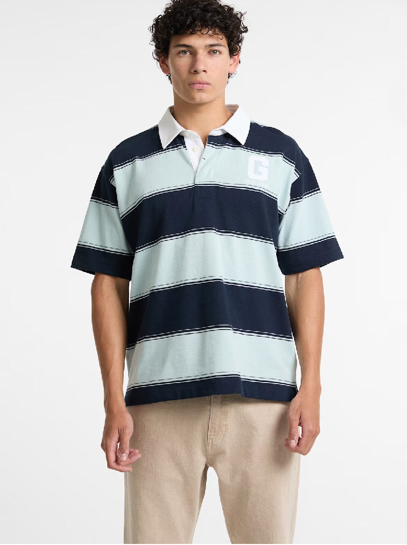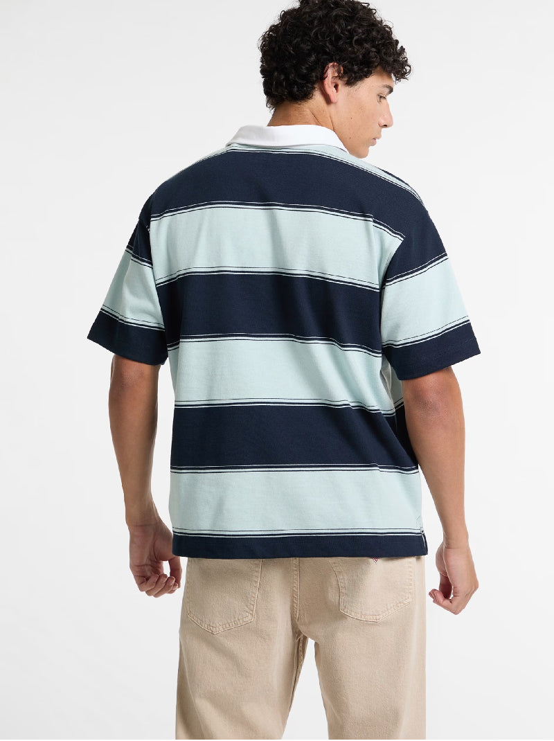 เสื้อโปโลรักบี้ ตัดเย็บจากผ้าถักปิเกต์คุณภาพดี ผลิตจากผ้าฝ้ายออร์แกนิก 50% และผ้าฝ้ายรีไซเคิล 50% ให้สัมผัสนุ่มสบายและเป็นมิตรต่อสิ่งแวดล้อม ดีไซน์ลายทางแนวนอน คอปกพับ สาบกระดุม และโลโก้ปะ เพิ่มความโดดเด่น ทรงหลวม แขนสั้น สวมใส่สบาย เหมาะสำหรับลุคลำลองหรือใส่ในวันพักผ่อน