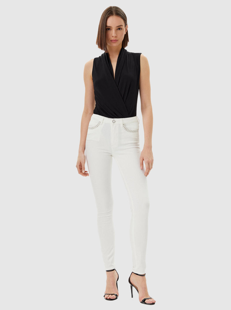 ยกระดับลุคเดนิมของคุณด้วยกางเกงยีนส์เอวสูงทรงสกินนี่สีขาวสดใส โดดเด่นด้วยดีไซน์ตกแต่งคริสตัลระยิบระยับบริเวณกระเป๋าหน้าทั้งสองข้าง เพิ่มความหรูหราให้กับทรงคลาสสิก กางเกงตัวนี้ออกแบบมาให้พอดีตัวเพื่อเน้นสัดส่วน เหมาะสำหรับสวมใส่ได้ทั้งกลางวันและกลางคืน พร้อมดีเทลซิปและกระดุมปิดด้านหน้า ห่วงเข็มขัด และกระเป๋าหลังที่ประดับด้วยโลโก้สามเหลี่ยมอันเป็นเอกลักษณ์ของ GUESS