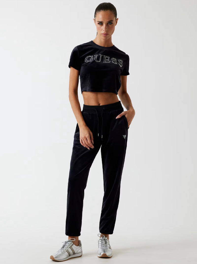 ยกระดับสไตล์ของคุณด้วยเสื้อยืดกำมะหยี่สุดชิคตัวนี้ ทรงครอปทรงกล่องและคอกลมสุดคลาสสิกให้ลุคร่วมสมัย โดดเด่นด้วยตัวอักษรโลโก้ประดับคริสตัลด้านหน้า เหมาะสำหรับออกไปเที่ยวกลางคืน พร้อมสัมผัสความยั่งยืนด้วยวัสดุรีไซเคิล